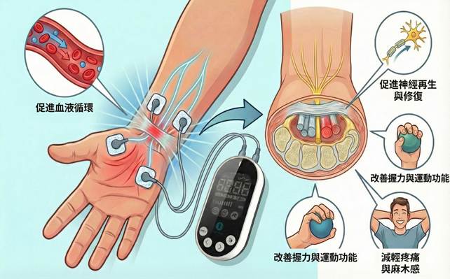 ● 改善運動表現: 臨床實驗發現,術後使用電刺激能顯著提升手部的精細動作技能(如 Jebsen-Taylor 評量)與肌肉力量。